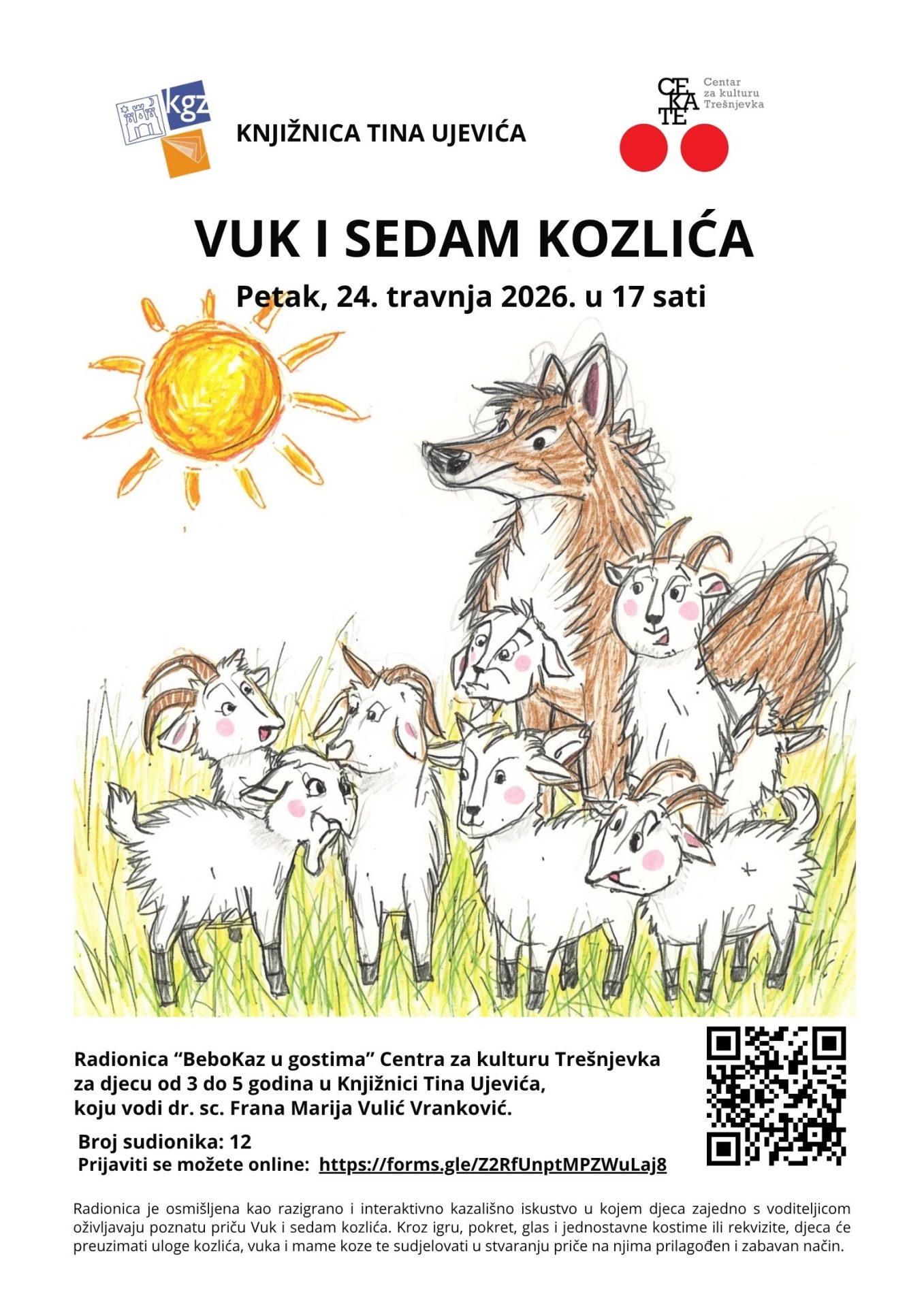 Radionica je osmišljena kao razigrano i interaktivno kazališno iskustvo u kojem djeca zajedno s voditeljicom oživljavaju poznatu priču Vuk i sedam kozlića. Kroz igru, pokret, glas i jednostavne kostime ili rekvizite, djeca će preuzimati uloge kozlića, vuka i mame koze te sudjelovati u stvaranju priče na njima prilagođen i zabavan način.