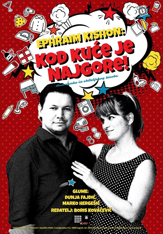 Ove se kazališne jeseni Kovačević odlučio postaviti na scenu Kazališta KNAP u okviru Centra kulture na Peščenici tekst slavnoga izraelskog pisca humoreski Ephrama Kishona – ˝Kod kuće je najgore˝, s glumcima Dunjom Fajdić i Markom Hergešićem. Predstavu autora čija su djela prevođenija od Biblije pogledali smo u kazalištu ispunjenom teatarskim knapovim fanovima u Noći kazališta 17. Studenoga u subotu, tjedan prije svečane dodjele Nagrada hrvatskog glumišta. Predstava na duhovit način slijedeći poznati tekst humorističnim kazališnim rezovima secira društvo i svakodnevnicu. U tim se kazališnim igrama fiktivnoga, a svima prepoznatljiva bračna para svaki gledatelj može se naći, a pokušati snaći prizivajući obiteljske i prijateljske odnose, popravke u kući, događaje s majstorima, putovanja, bračne izlaske, obiteljska druženja, odrastanje djece, problemi s kućanskim uređajima. Najviše smijeha u gledalištu zaziva izvrsna epizoda o stroju za pranje rublja koji šeće po kući i postaje gotovo kućni ljubimac, nazvan Jonathan. Svakodnevni se događaji dovode do krajnosti prekrivajući na tim rubovima svakodnevni život elementima apsurdnosti i grotesknosti, a oni pak dovode gotovo do komedijske katarzičnosti i pročišćenja duha i uma gledatelja. Iznimno uigrani i zaigrani glumci kreću se po oštrim rubovima mogućega prijelaza u estradno i karikaturalno, ali ostaju duhoviti i komunikabilni. Uvodno iznenađujući, iznimno dobro svladani u tjelesnim govornim tehnikama, dobrim pjevačkim dionicama, fleksibilnim metamoforznim i doslovnim okretima ostvaruju stalne promjene karaktera u bljeskovima novih fragmenata. Dokumentaristički, a stilizirano, poigravaju se problemima razotkrivajući mane i zrcaleći hrvatsko društvo, ne banalizirajući ga i ne osuđujući. Predstava sa samo dva kubusa, jednostavna taburea, bez promjene kostima tijekom izvedbe. Dobre kostime potpisuje Vesna Mihetec i frizure. Prikazuje cijelu lepezu glumačkih mogućnosti i sposobnosti. Rezultat je osmjeh na licu gledatelja koji uživaju u ludičnosti i ljepoti, zaigranosti i posebnosti glumačke igre, sinergiji izvrsnoga teksta, maštovitoga redatelja i za igru spremnih glumaca – Dunje Fajdić i Marka Hergešića.