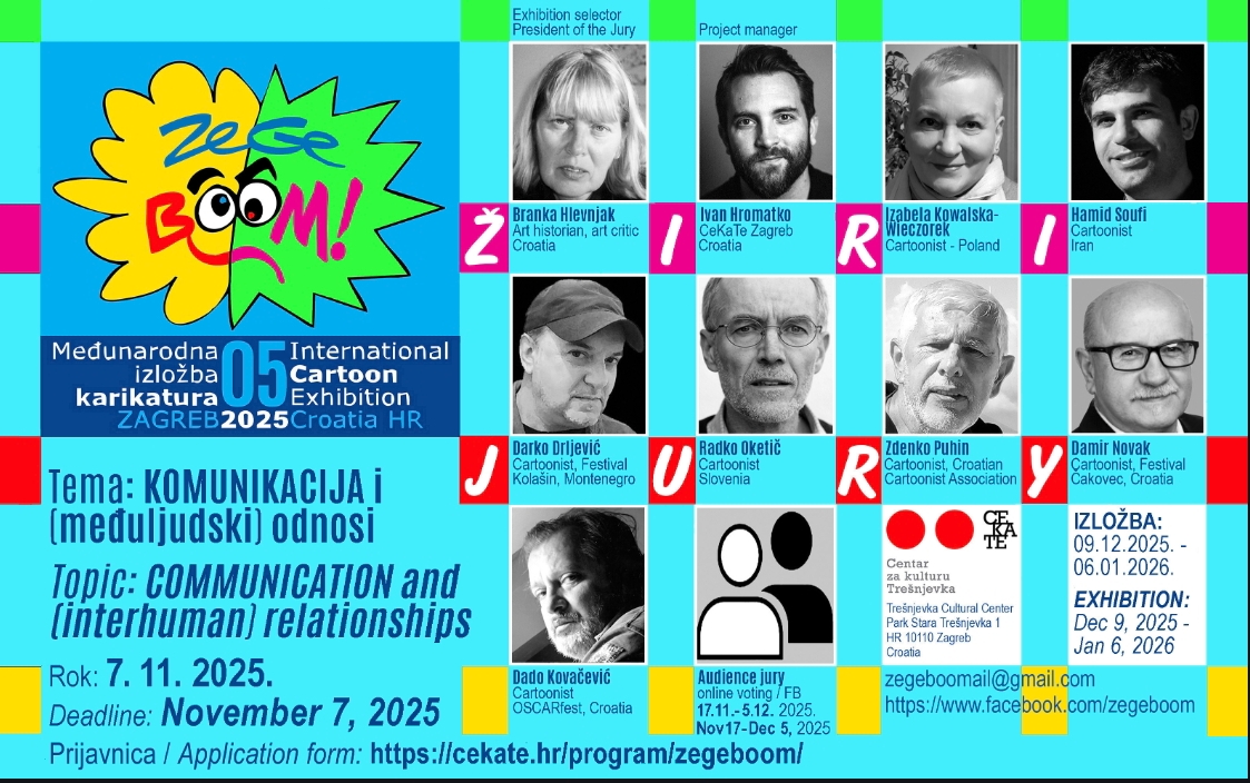 Prijave na natječaj su otvorene od 6. listopada do 7. studenog 2025. godine, a mogu se prijaviti baš SVI zainteresirani – bez obzira na iskustvo, dob, spol, religiju, nacionalnost ili bilo koju drugu (više ili manje bitnu) karakteristiku autora. Autori mogu dostaviti 1-3 “tihe” karikature (bez teksta!), prateći prijedloge natječaja i odgovarajući na svoj jedinstven i kreativan način na zadanu temu. Po završetku prijave, stručni žiri će odabrati najbolje među pristiglim radovima, a zatim će javnost moći glasovati i izabrati radove koji će biti i nagrađeni. Bez obzira na rezultate glasovanja, svi će sudionici dobiti certifikat o sudjelovanju, te će njihovi izabrani radovi biti objavljeni u 3. ZeGeBOOM! katalogu karikatura. Pobjednici natječaja dodatno će zavrijediti i vrijedne nagrade! Online glasovanje će biti dostupno diljem svijeta i otvoreno od 21. studenog do 3. prosinca 2024. godine. Najbolji radovi bit će izloženi od 10. prosinca do 31. prosinca 2024. godine u Maloj galeriji Centra za kulturu Trešnjevka, a svi ostali pristigli radovi bit će dostupni online – kako bi svima omogućili uživanje u umjetnosti karikature!